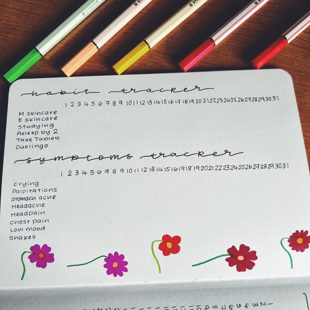 I decided to add the symptoms tracker back this month as I really wanted to keep track of them this month with exams coming up. I included it in the same spread as my habit tracker as there was room for me to do that.