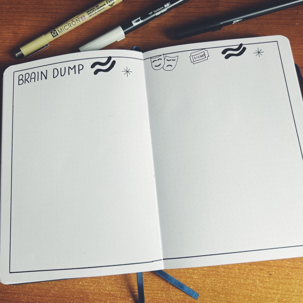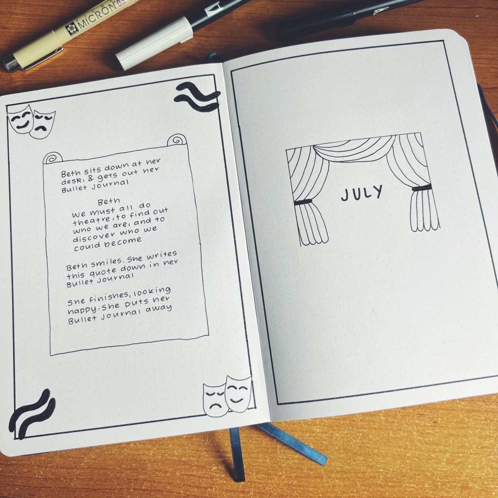 For my quote page, I decided to write it out like a script. I’m actually quite proud that I came up with this and included actions like me sitting down and writing it in the Bullet Journal. I then included some theatre masks and just some wavy lines in the corner and I really like how it turned out.