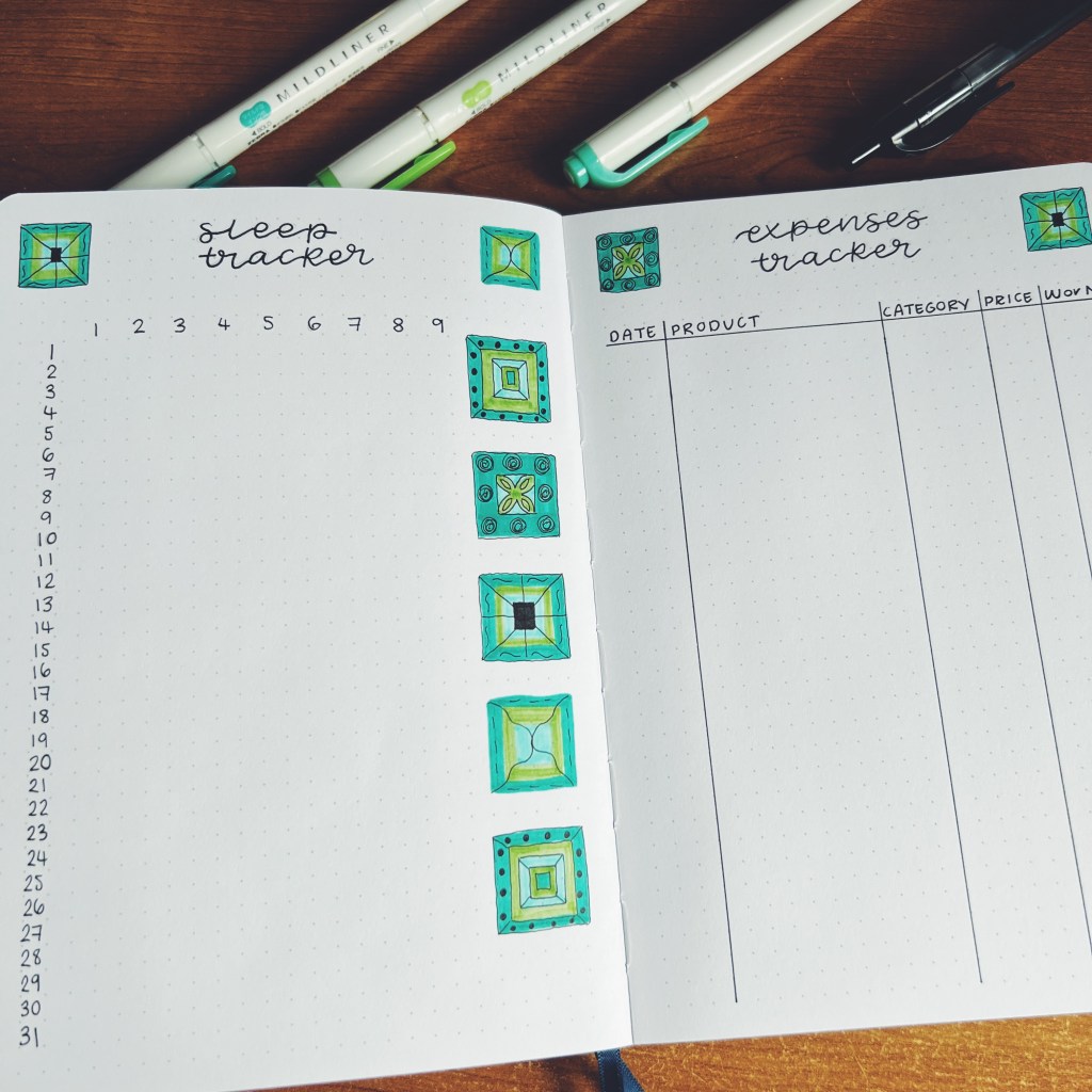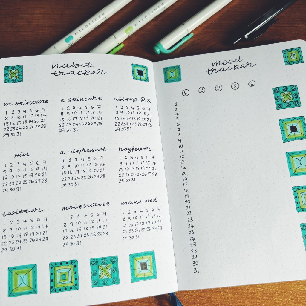 For my habit tracker, I kept the same layout from the last couple of months as it has worked really well for me. I really enjoy having separate trackers for each habit. It’s something that works well for me and my brain. I included more mosaic tiles to fill the space at the bottom and I really like the way it looks.