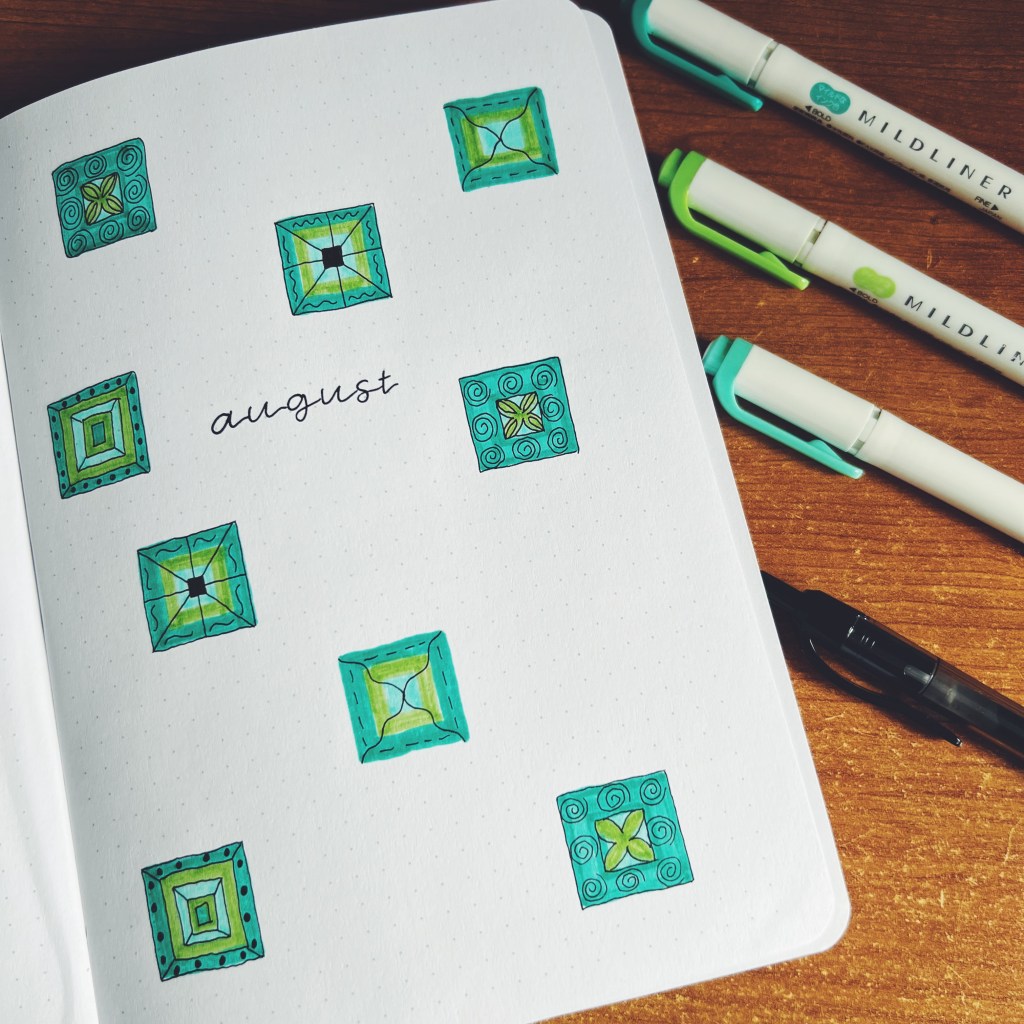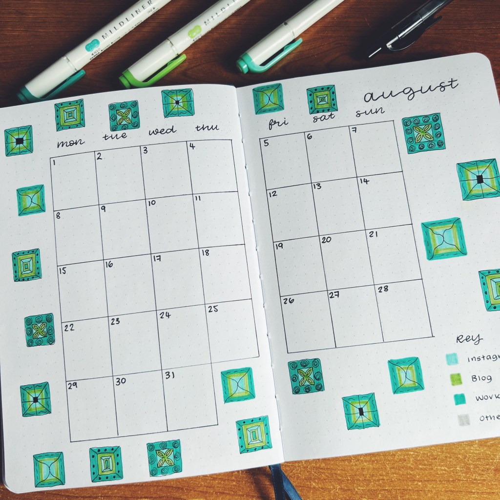 Like I mentioned previously, this month I went for a mosaic theme. I decided to go for green as the main colours of this month as I haven’t used green in a while. I made 4 different types of mosaic tiles just to add a bit of a variety and I drew these at random around August in the middle. I used a simple cursive font for this month and I really like how the cover page turned out!