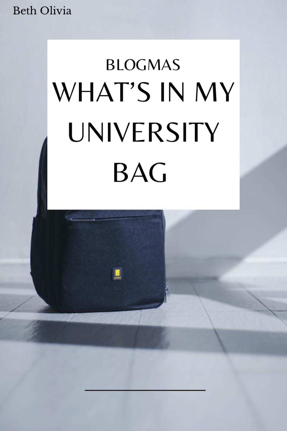 Welcome to another blogmas post. In today’s post, I’m going to be sharing everything that is in my university bag. Everything in my bag is something that I will need at university at some point during the day. Of course, it doesn’t just include pen and paper and all of that wonderful stuff. It also includes things I would take with me to other places and not just university. Without further ado, let’s get to it.