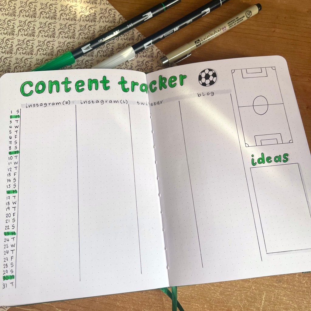 Once again, my content tracker for this month remains the same. I’ve created a table that includes the social media apps that I post on and I will use this to keep track of what I’m posting and when I’m posting on it. I had some space to the right of the table and so I decided to include a little ideas section to brainstorm any ideas I get about content. I kept the theme going for this page too and I really like how it turned out!