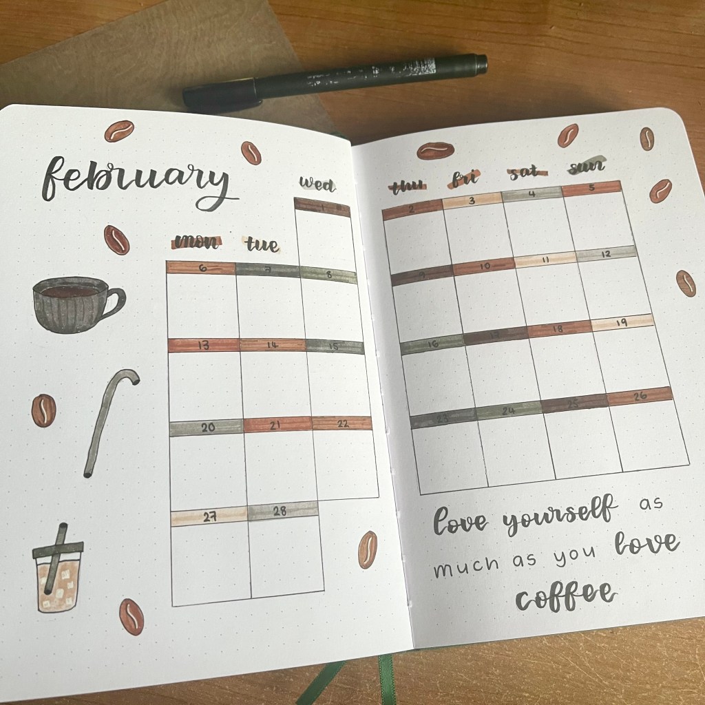 For my monthly spread, I of course went for a calendar layout. Each square is 5 by 5 dots which continues to work really well for me. I included lots of doodles related to coffee in some way and I love the muted colour palette for this month too.