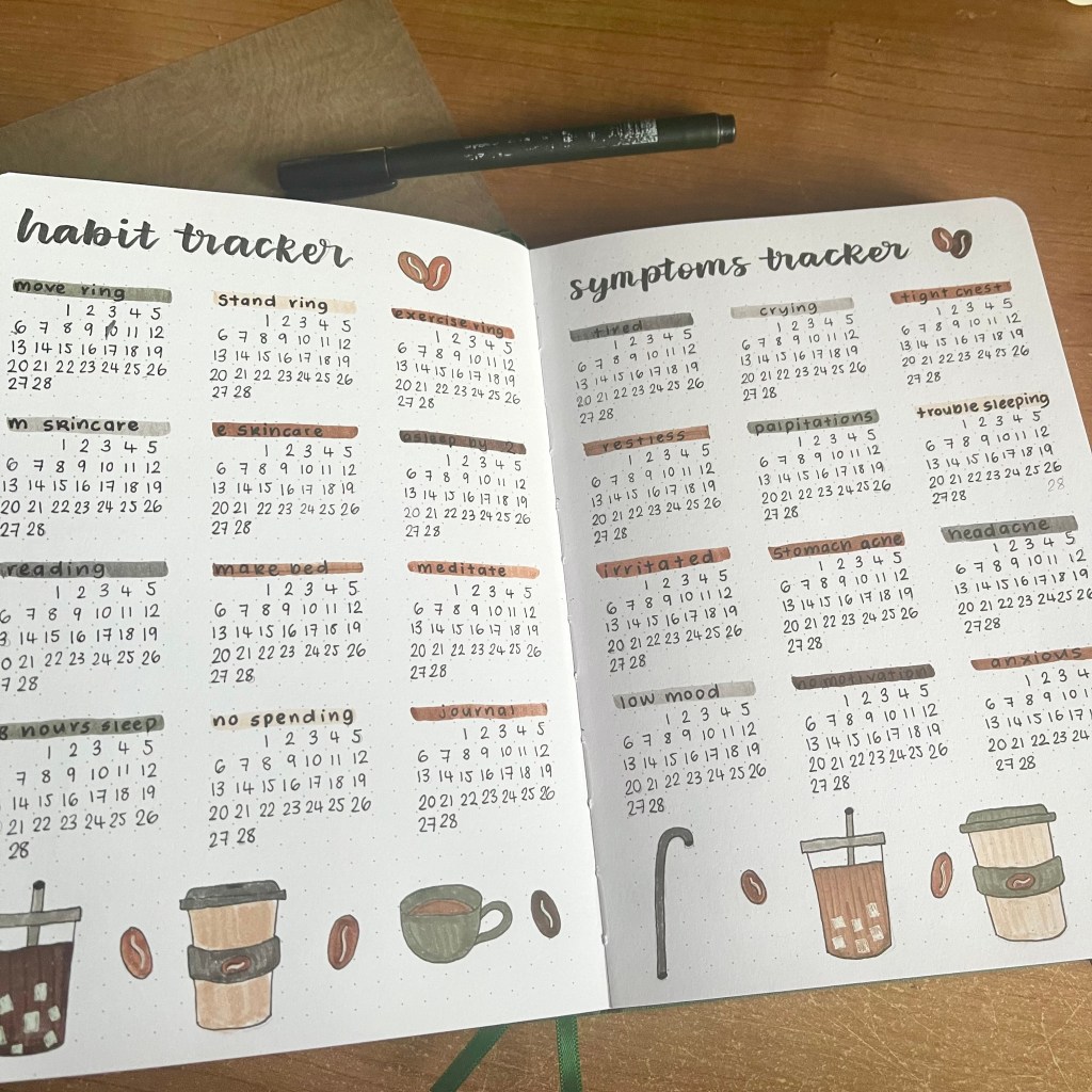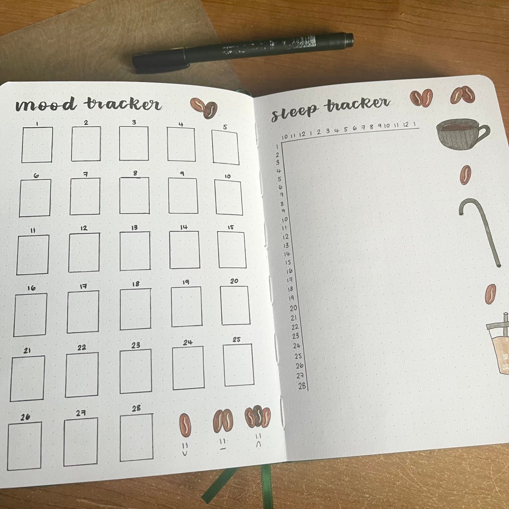 For my mood tracker, I decided to go for a doodle layout. With this tracker, the more coffee beans I doodle, the worse my mood is on a particular day. I haven’t done a layout like this for a couple of years now so I’m looking forward to using it this month.