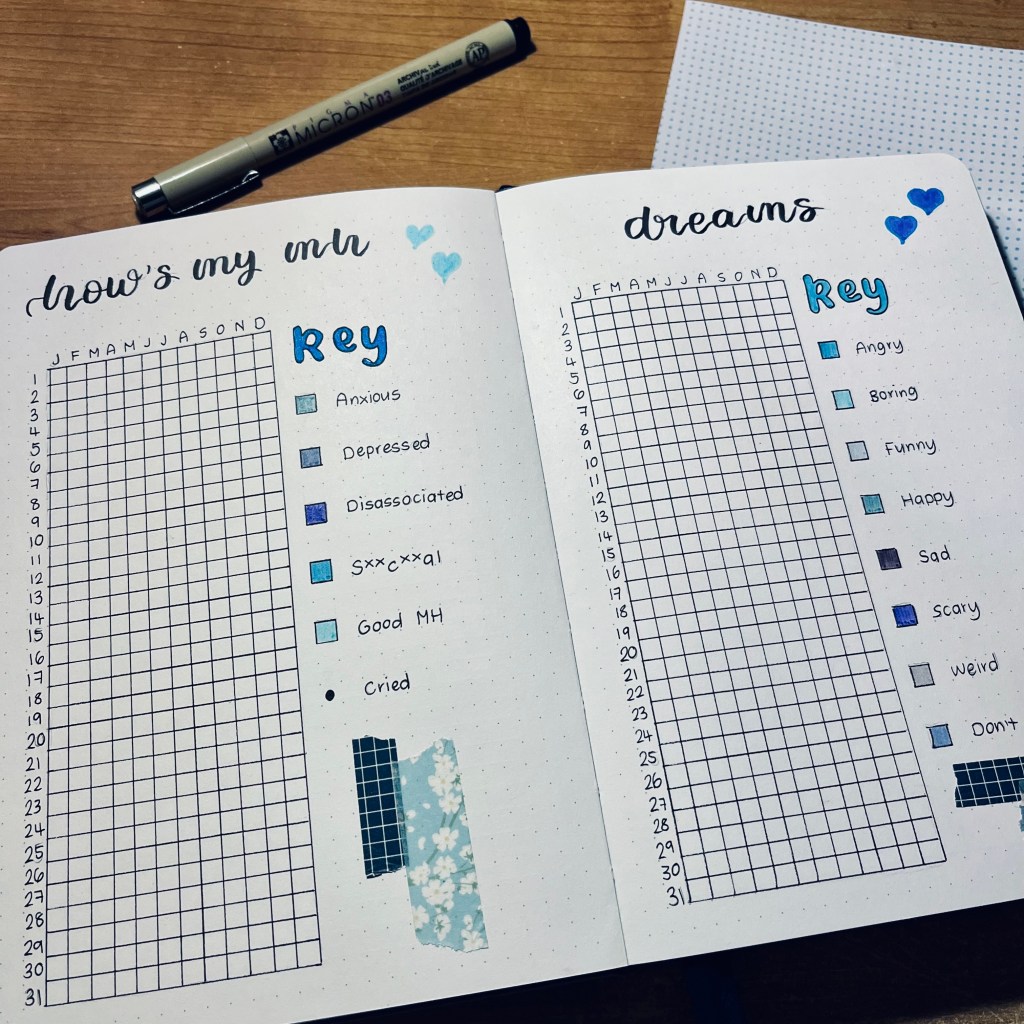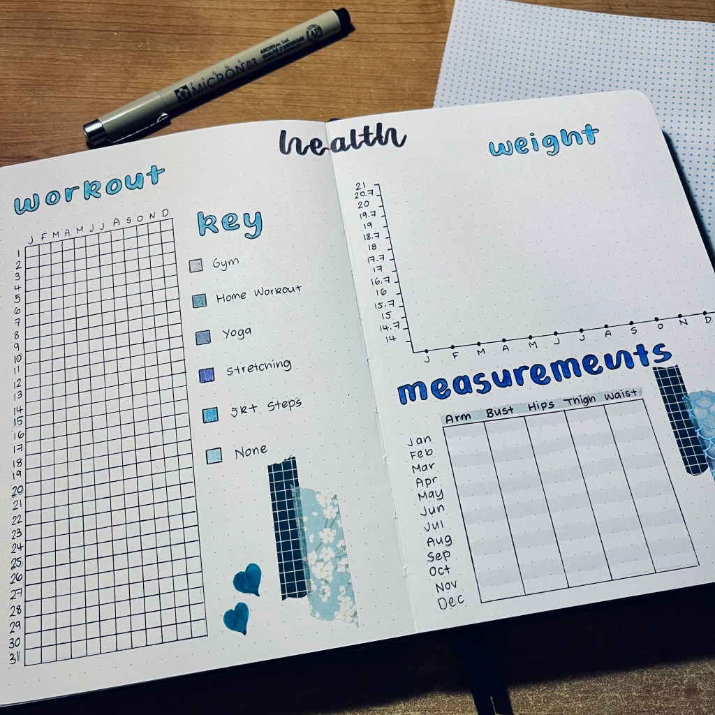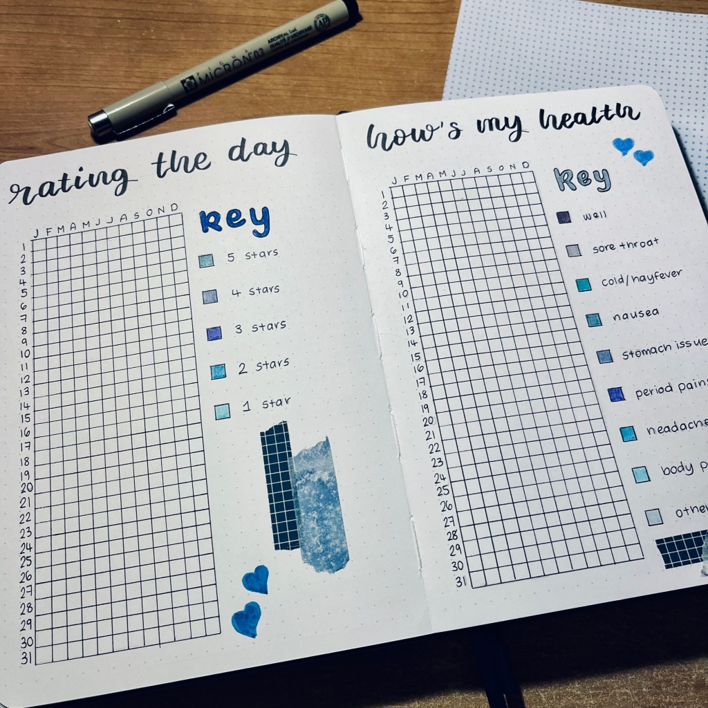 This notebook should last me for the first 6 months of the year which I always think is satisfying. Therefore, I’ve taken that into consideration with some of my spreads as you will see. I’ve gone for a theme based on my notebook itself. With the blue and the chunky elastic closure alongside the heart, it gave me inspiration to do a blue theme with washi tape and hearts. With all that being said, let’s get to it!