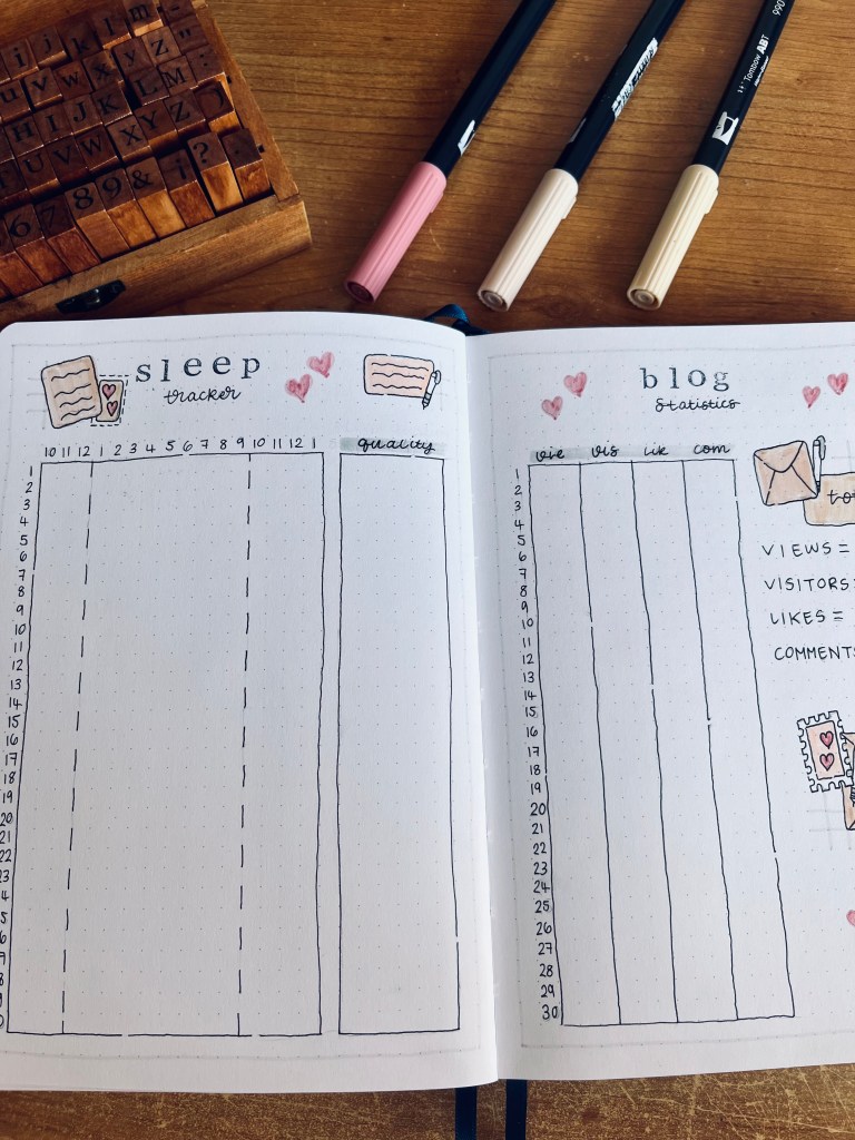 As always, there are a couple of changes I want to mention. I’ve gone back to a double-page calendar spread as I have a busy month coming up. In my sleep tracker, I’ve added lines where I want the ideal time to be asleep and wake up noted. I’ve also gone back to a gratitude log this month with a different layout to see if that works better for me. One month, I will find the perfect gratitude journaling layout! Of course, I have changed the layoust on a couple of other spreads like my habit and mood tracker but they change every month anyway.