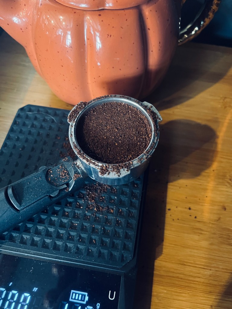 I must apologise in advance but as you can tell, I am not the tidiest when it comes to making coffee. In fairness, I am this messy when it comes to my actual barista job. Anyway, once I’ve got the amount of coffee I need correct, I will tamp it down.