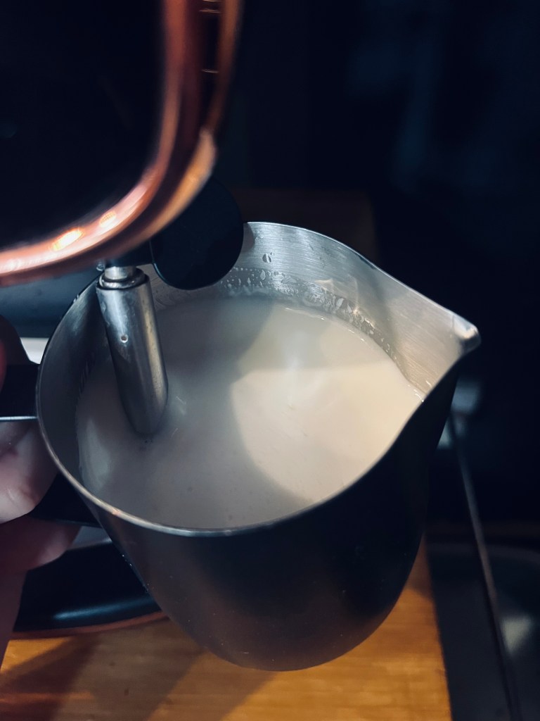 If you happen to want to steam milk, you essentially need to create a whirlpool effect. It’s hard to see in the photo but that’s what I did until the milk was the required temperature. I don’t have a temperature gauge at home, so I base it on when I can’t hold the jug anymore.
