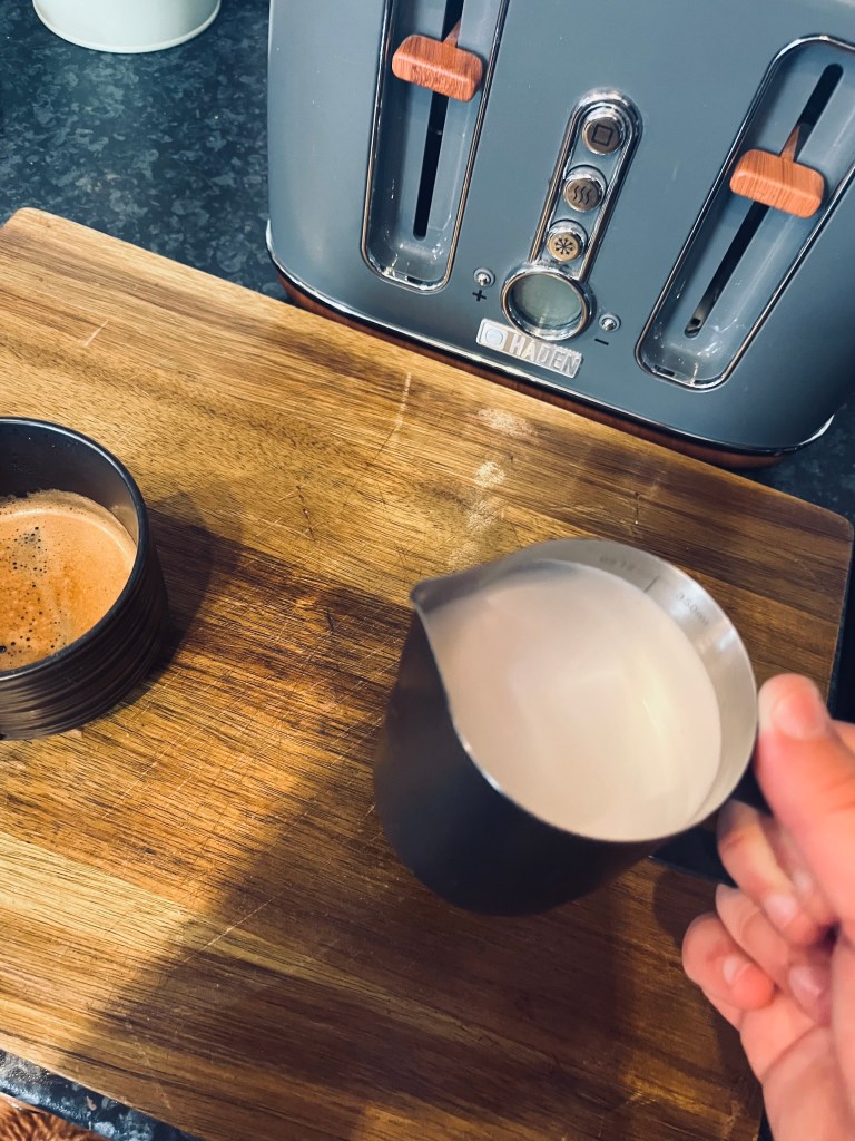 Once I’ve got my coffee ibuprofen the cup, I started to prepare the milk. I added enough to just go over the ridge where the pourer is. Now, I am not an expert when it comes to steaming milk (even though it’s literally my job) but this is what works best for me to get latte art.