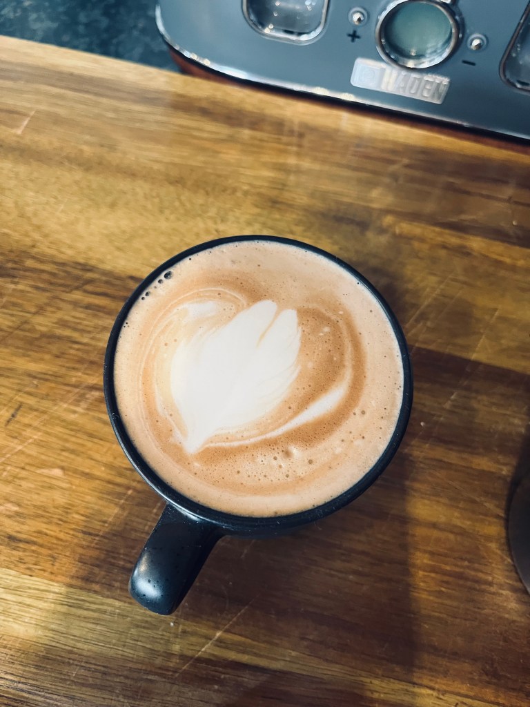 Once the milk was done, you can see in the photo how silky it looks. That’s kind of what you want it to look like. To help with that, bang the jug a couple of times and swirl the coffee round. This helps to blend the foam together, adding to that silky effect!