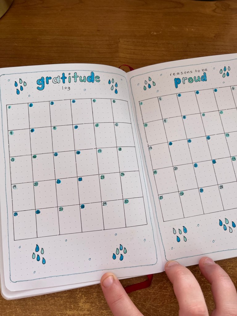 As for changes this month, I’ve added a new spread that is actually an old favourite and that is my reasons to be proud spread. This is simply where I document something that I’m proud of each day and I got this idea from Helen at Journal With Purpose quite a few years ago. I added this back because I didn’t like the fact that my gratitude spread was over two pages in March. It was too much space that I don’t need so it’s back to a single page spread.